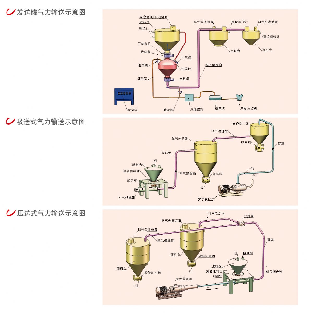 正壓和負(fù)壓也可進(jìn)行組合應(yīng)用以滿足特殊要求,比較適用于多點供料單點出料的輸送方式,通常為輸送粉狀、小顆?;虮戎剌^輕的物料。